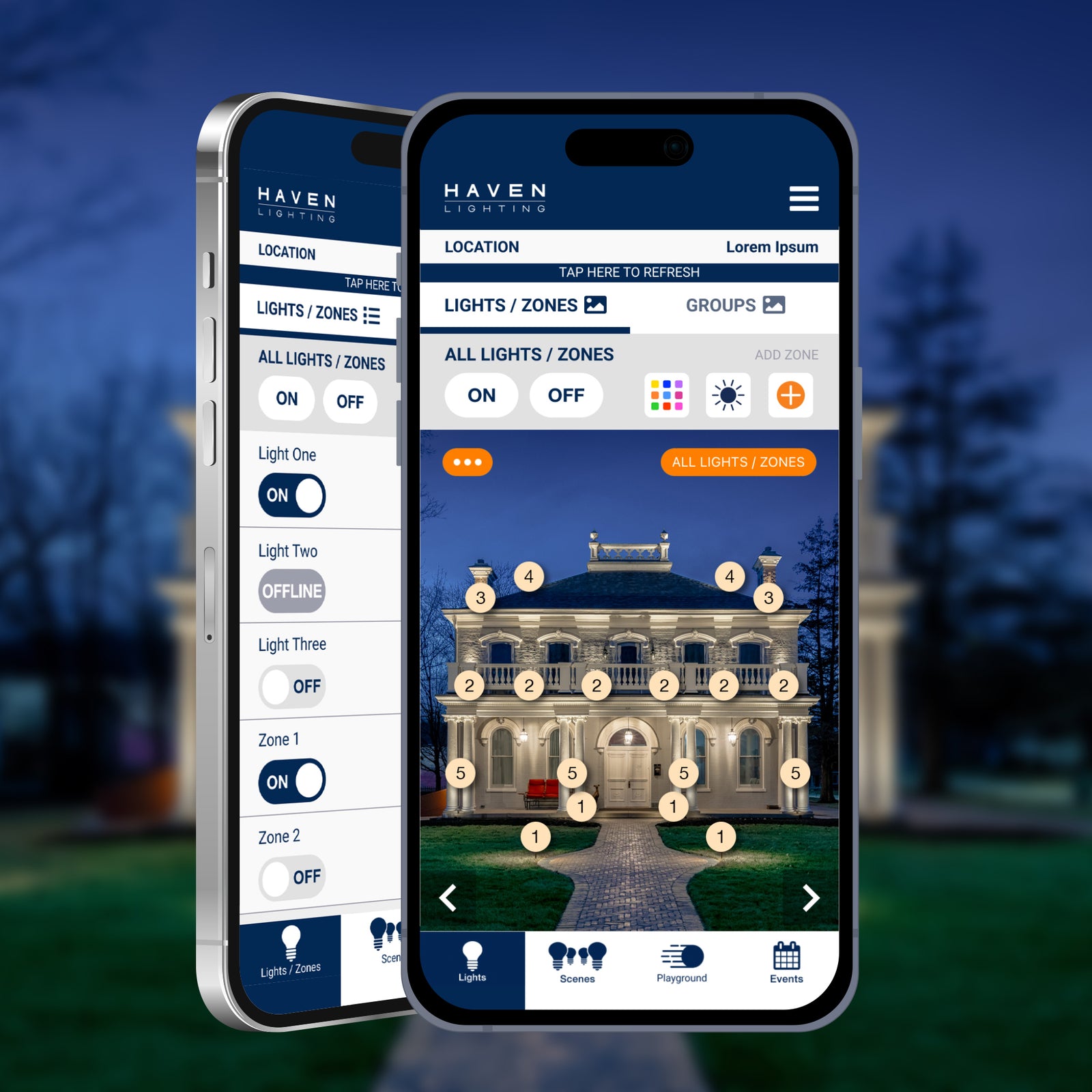 Haven Landscape Lighting's patent-pending mobile app makes setting up and controlling your 8 Series Smart Lighting a breeze. You can effortlessly manage each light individually, giving you complete control over on/off functions, dimming, and color temperature adjustments. Experience the ultimate convenience and customization right at your fingertips.